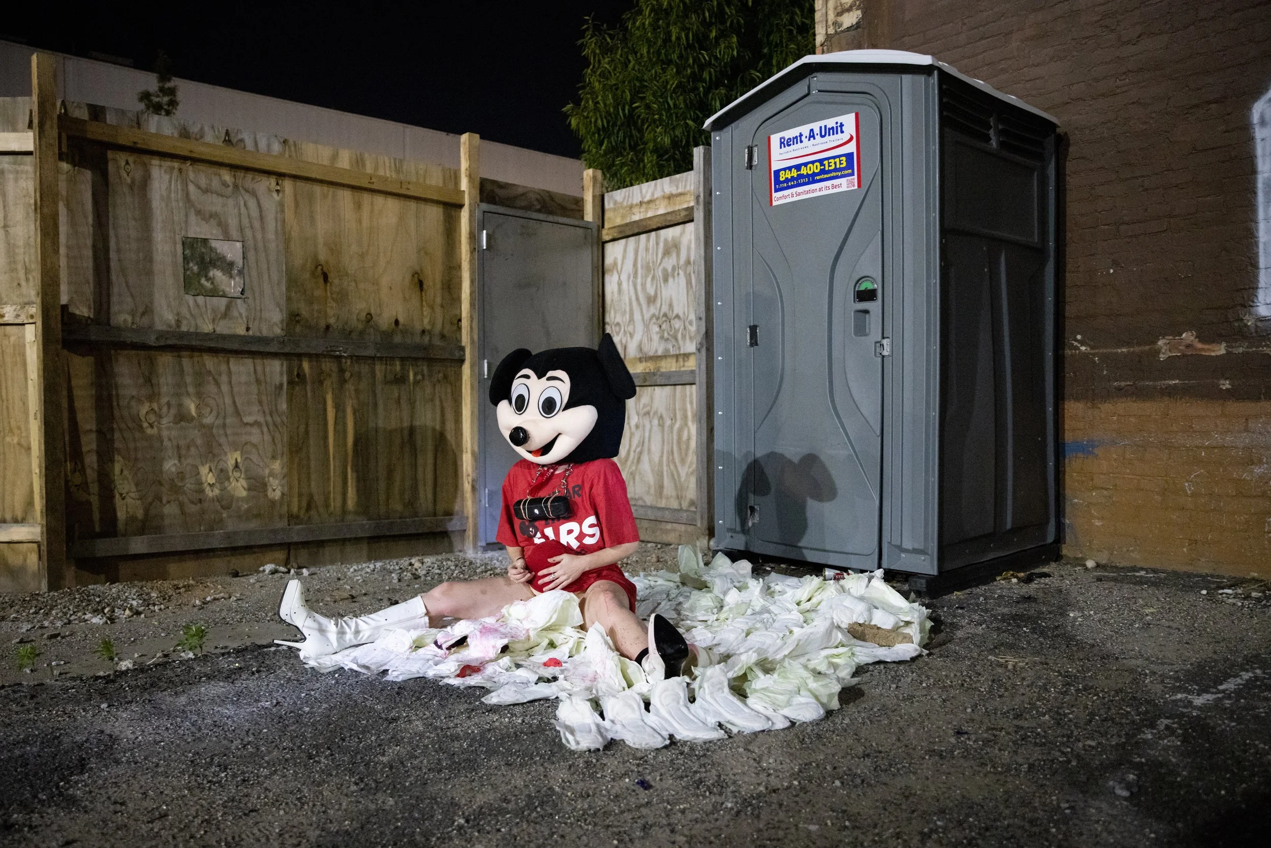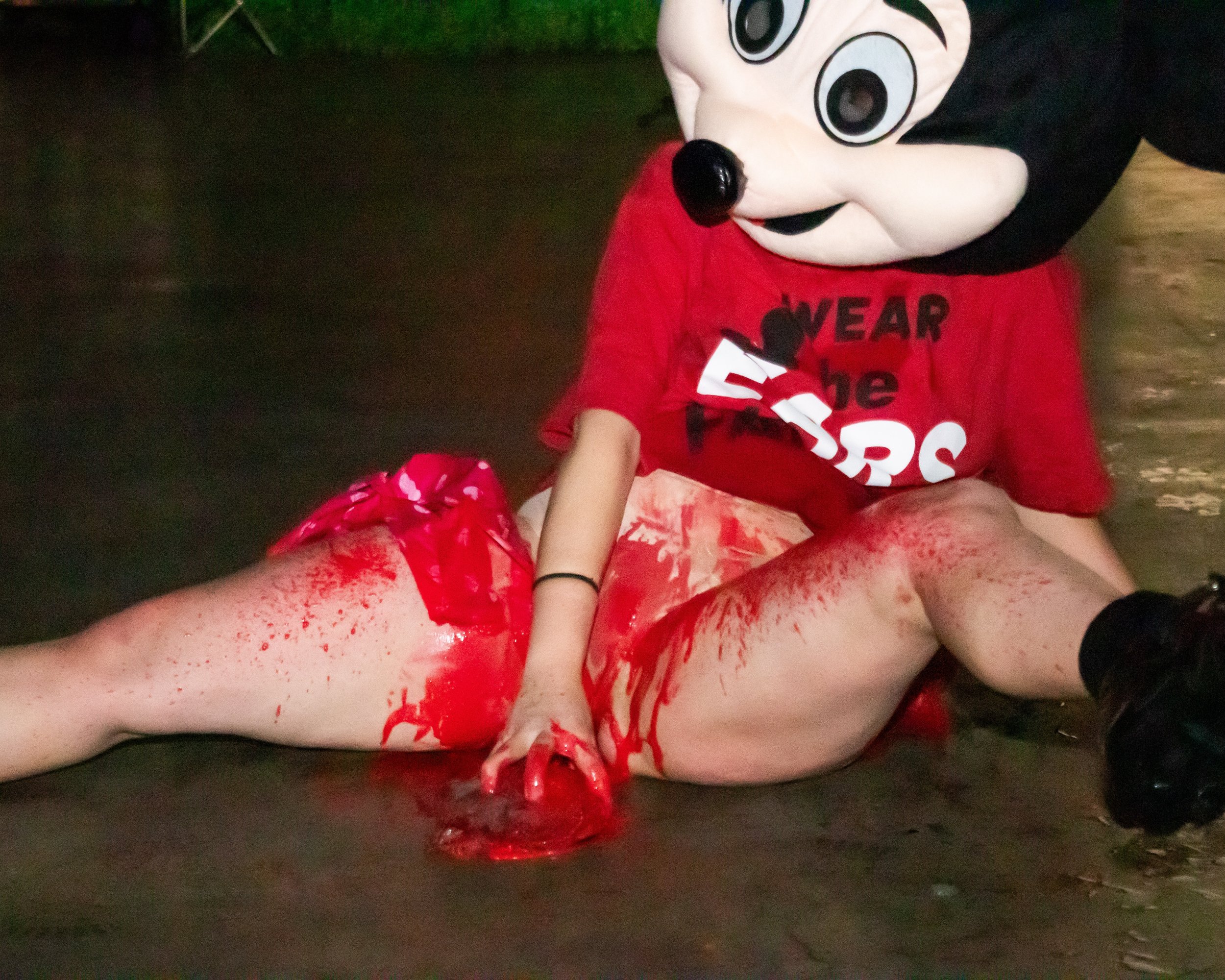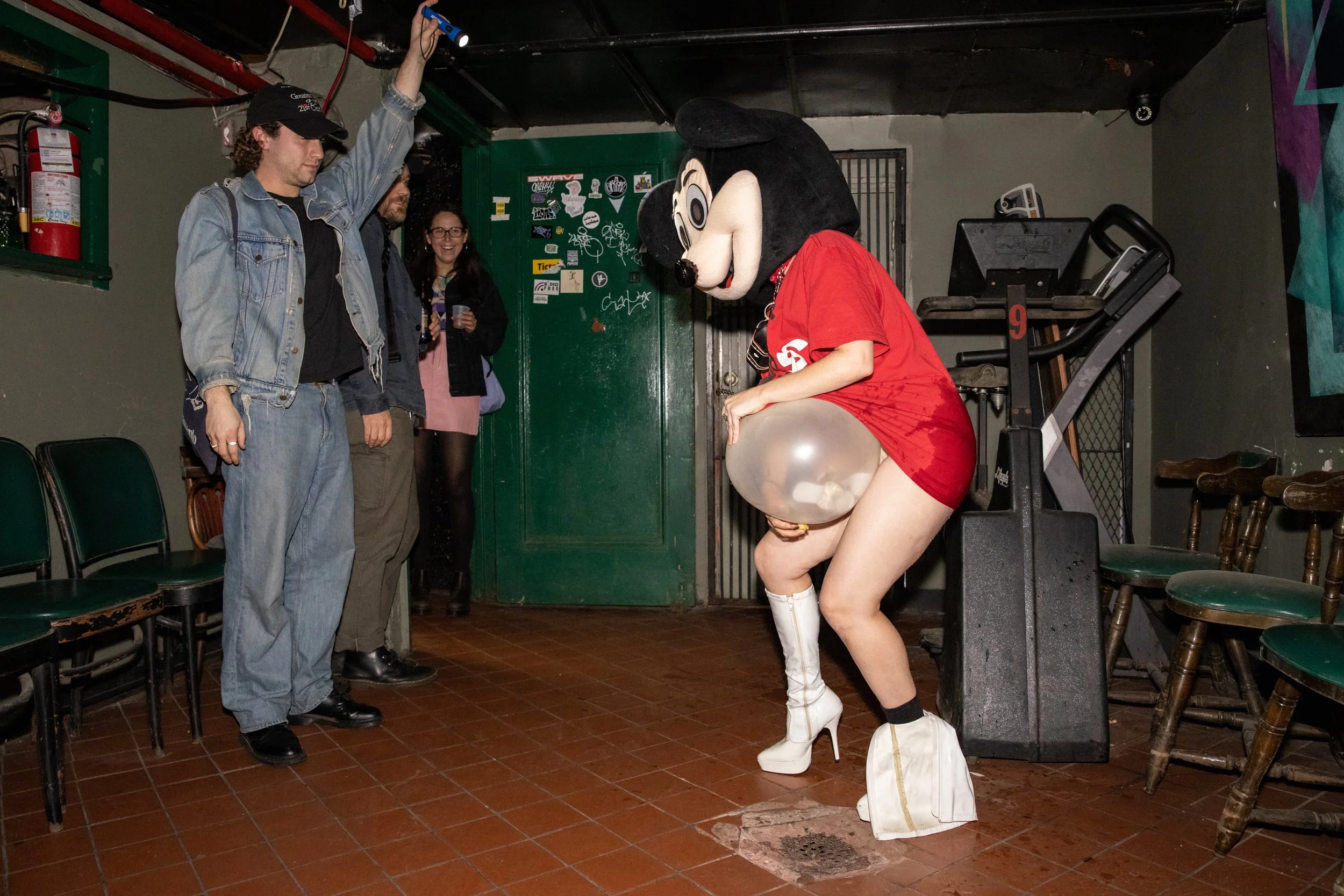 Mickey haunts the dark interiors of a downtown loft. A portable speaker chained to his neck blasts a Brutalismus 3000 electroclash anthem about how to be a Good Girl. “If you want to be a good girl you must follow these simple rules.” Mickey is inebriated, stumbling through the mobbed audience. Viewers are instructed to turn on their phone flashlights and “Follow Mickey.” The crowd trails Mickey as crashes around the space, digging out large balloon bellies from hidden corners and stuffing them up his shirt. Each belly is quickly and violently aborted as a sharp needle gauges his belly repeatedly. The bellies spray their contents everywhere, leaving a trail of blood, stuffed mice, seaweed, water, lube, plastic Disney figurines, and glitter.