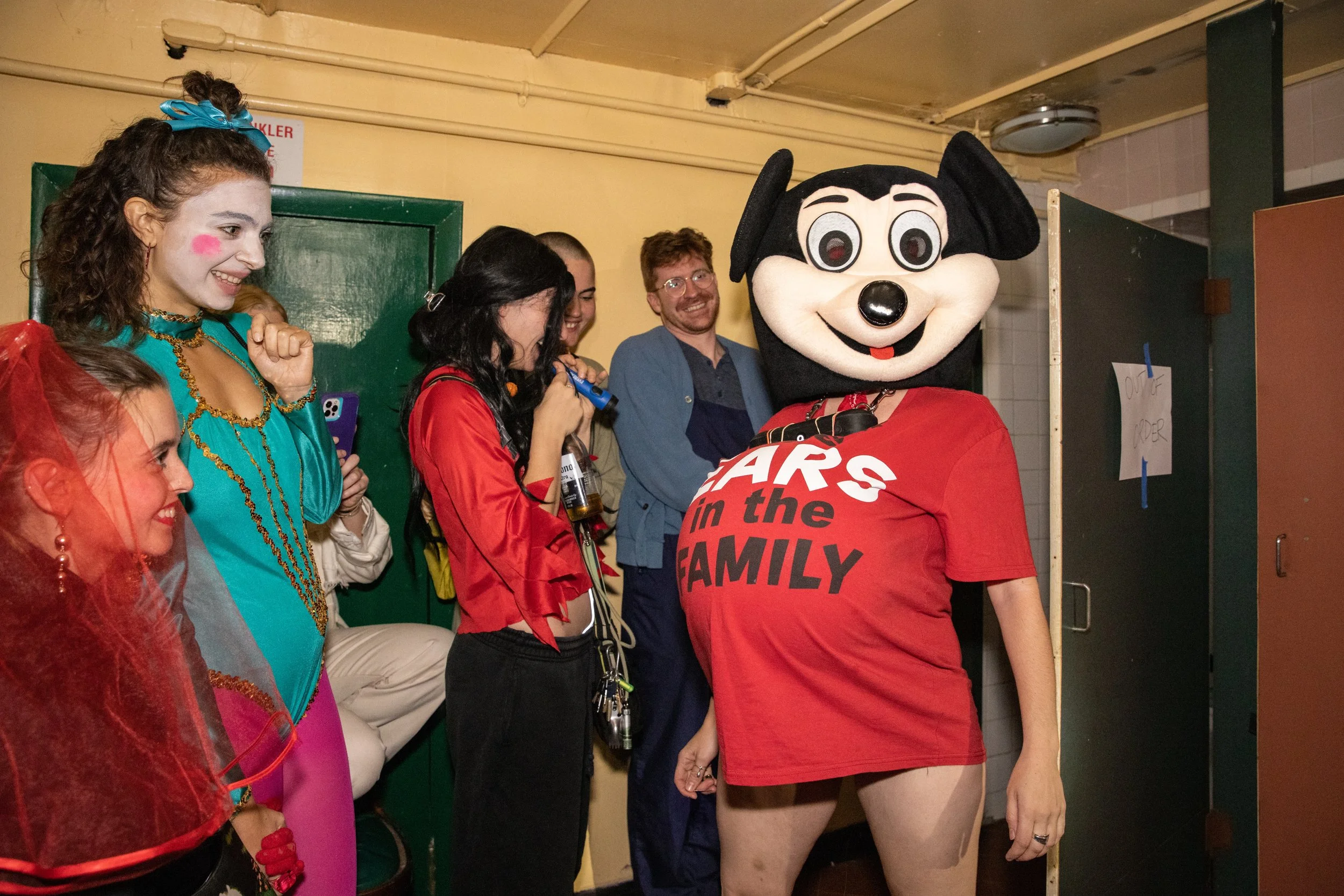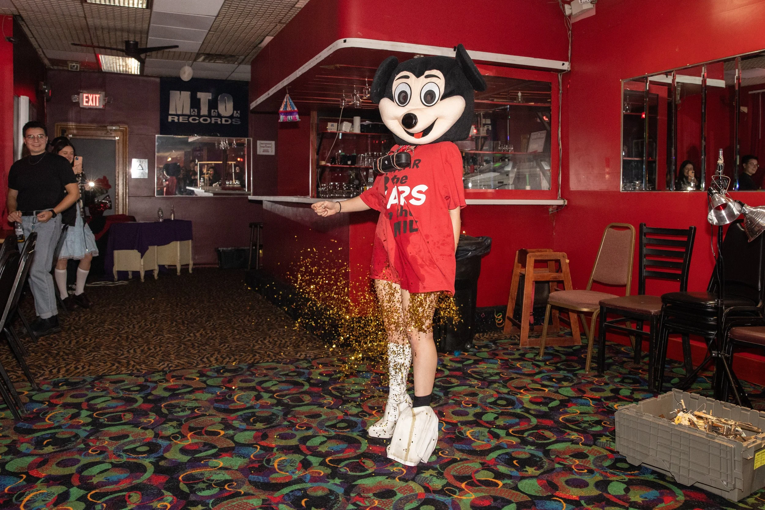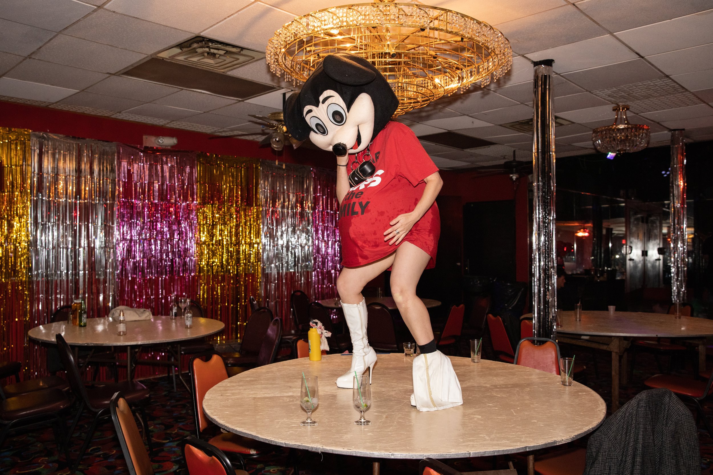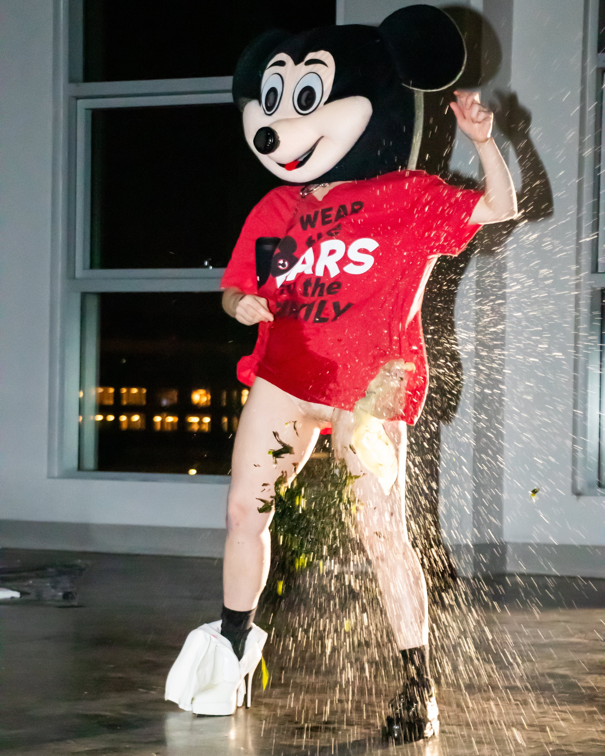 Mickey haunts the dark interiors of a downtown loft. A portable speaker chained to his neck blasts a Brutalismus 3000 electroclash anthem about how to be a Good Girl. “If you want to be a good girl you must follow these simple rules.” Mickey is inebriated, stumbling through the mobbed audience. Viewers are instructed to turn on their phone flashlights and “Follow Mickey.” The crowd trails Mickey as crashes around the space, digging out large balloon bellies from hidden corners and stuffing them up his shirt. Each belly is quickly and violently aborted as a sharp needle gauges his belly repeatedly. The bellies spray their contents everywhere, leaving a trail of blood, stuffed mice, seaweed, water, lube, plastic Disney figurines, and glitter.